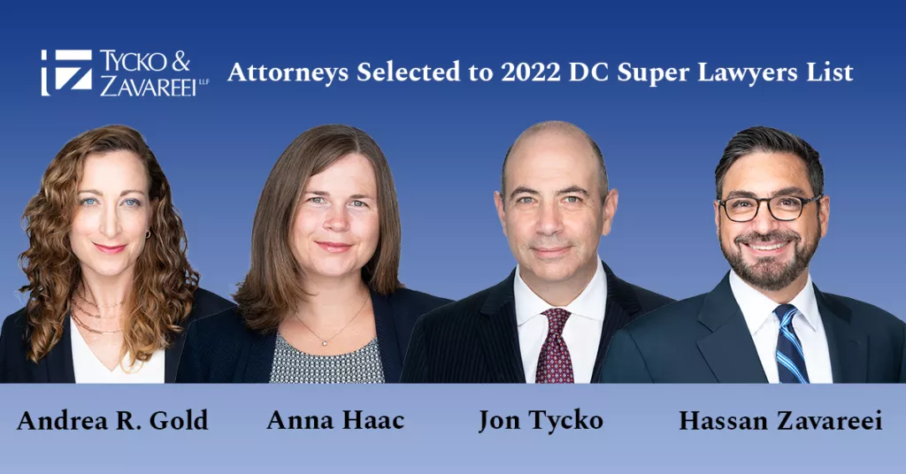 Partners Andrea R. Gold, Anna C. Haac, Hassan Zavareei, and Jonathan Tycko have been selected to the 2022 DC Super Lawyers list. Each year, no more than five percent of the lawyers in the state are selected by the research team at Super Lawyers to receive this honor.