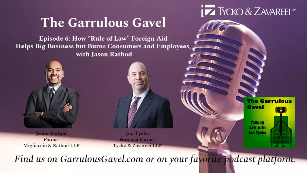 Check out the latest episode of The Garrulous Gavel, where Jon Tycko chats with Jason Rathod about the power of aggregate litigation in developing countries. Jason maintains an active class action practice as a Partner at Migliaccio & Rathod LLP. In this episode, Jason discusses his extensive writing about how the United States promulgates its legal system as “Rule of Law” aid in other countries and how this aid falls short in excluding legal protections for consumers and employees.