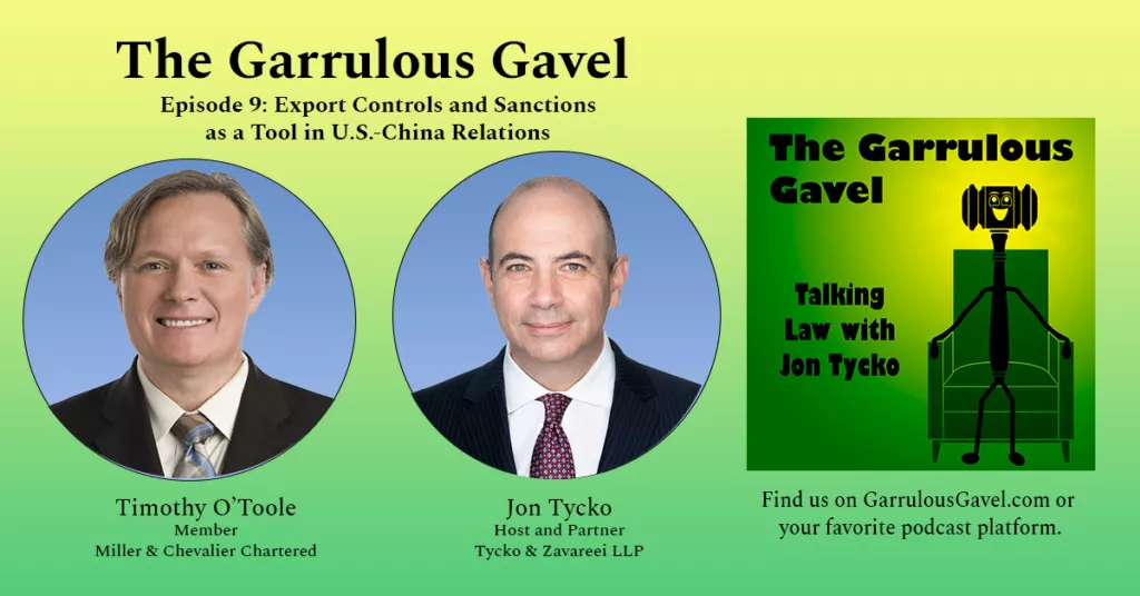 In the first episode of 2022 for The Garrulous Gavel, Jon Tycko chats with Timothy O’Toole about the ways in which the U.S. uses trade—and in particular controls on exports—as a national security and foreign policy tool. They get garrulous about how Tim pivoted his legal career from public defender to trade law specialist.
