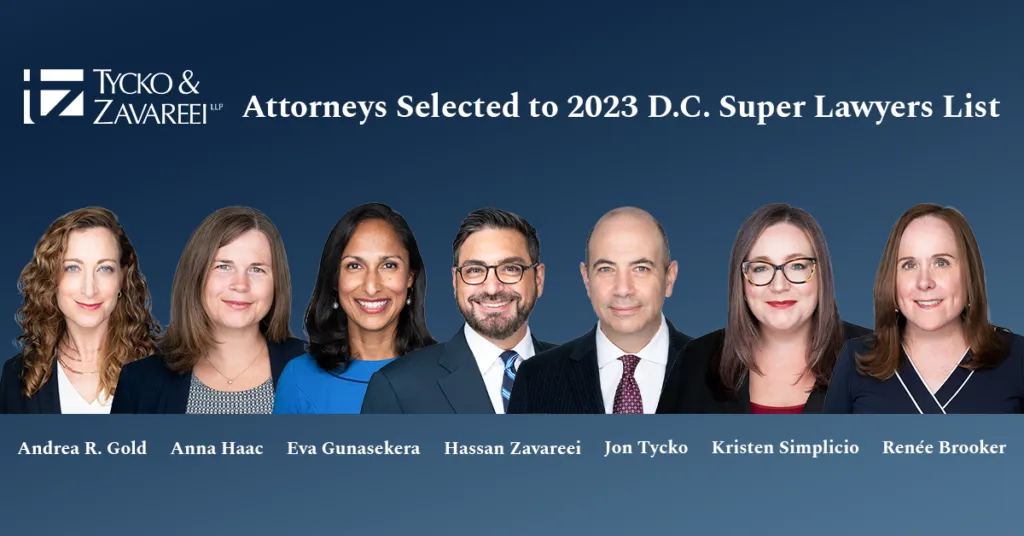 Partners Andrea R. Gold, Anna C. Haac, Eva Gunasekera, Hassan Zavareei, Jonathan Tycko, Kristen Simplicio, and Renée Brooker have been selected to the 2023 Washington, D.C. Super Lawyers list. Each year, no more than five percent of the lawyers in the state are selected by the research team at Super Lawyers to receive this honor.